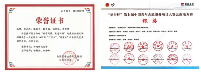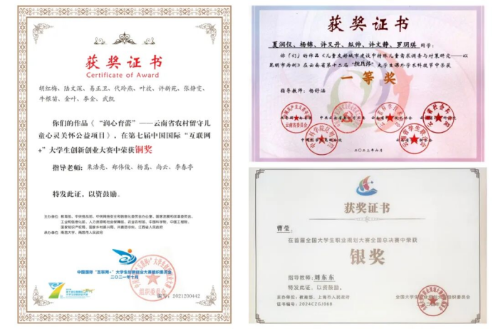 1名学生获首届全国大学生职业生涯规划大赛银奖,学生获中国大学生创新创业竞赛国赛铜奖1项、云南省“挑战杯”大学生科技作品竞赛一等奖1项,在省级及以上创新创业大赛中获奖25项,获国家奖学金、省级三好生等省级及以上荣誉482人次。