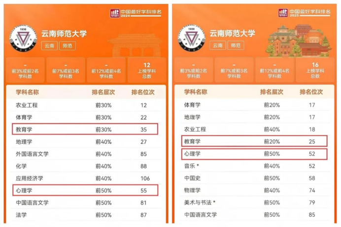 心理学科入选云南省重点培育博士点建设学科,形成了3个主干学科方向和1个优势特色方向,2024年软科排名首次上榜,2025年软科学科排名进入全国前50%。