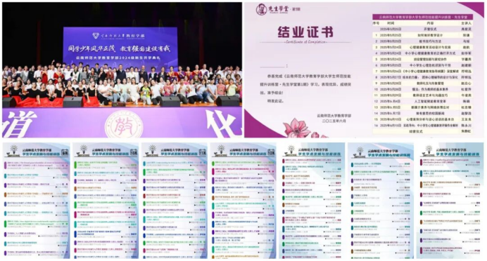 课程建设创新高。获批国家级一流本科课程5门,省级一流本科课程11门,省级“拓金计划”课程项目2门;B类以上课程23门,其中A-课程1门,B+课程5门;教改项目共32项,其中省级及以上7项,校级17项(含1项双语教学课程),校级优势本科专业核心课程建设8项;立项本科生课程思政项目13项,其中省级项目2项,校级项目11项;入选学校“西南联大精神弘扬和传承”本科课程思政优秀案例13项,推动1项专业知识图谱建设(教育学)与23门AI赋能智慧课程建设。