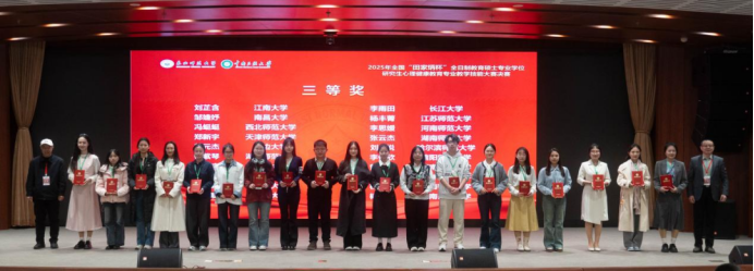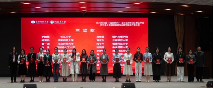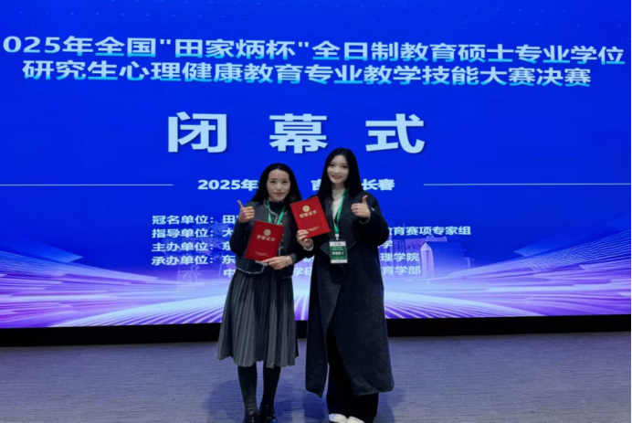 10月17—19日,2025年全国“田家炳杯”全日制教育硕士专业学位研究生“心理健康教育”专业教学技能大赛(决赛)在东北师范大学举行。教育学部参赛团队在决赛中取得优异成绩,2023级心理健康专业杨元美(指导教师:闫志英)、曹正彤(指导教师:何顺超)均荣获全国三等奖,辅导员李婕、闫晓飞带队。