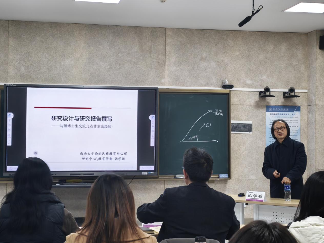2025年12月29日,教育部人文社会科学重点研究基地西南大学西南民族教育与心理研究中心主任、西南大学教育学部教授张学敏应邀为学部博士研究生开展题为《研究设计与研究报告撰写》的培养指导讲座。讲座由教育与社会发展博士点负责人尤伟琼教授主持,学部茶世俊教授作为与谈人参加交流研讨。