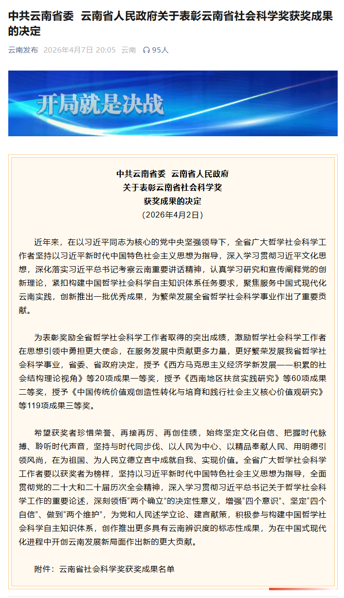 近日,根据“云南发布”微信公众号发布的《中共云南省委云南省人民政府关于表彰云南省社会科学奖获奖成果的决定》显示:教育学部申报的5 项教育类学术成果获奖,其中:2项成果获一等奖、3项成果获三等奖。学部一等奖获奖数量实现新突破。