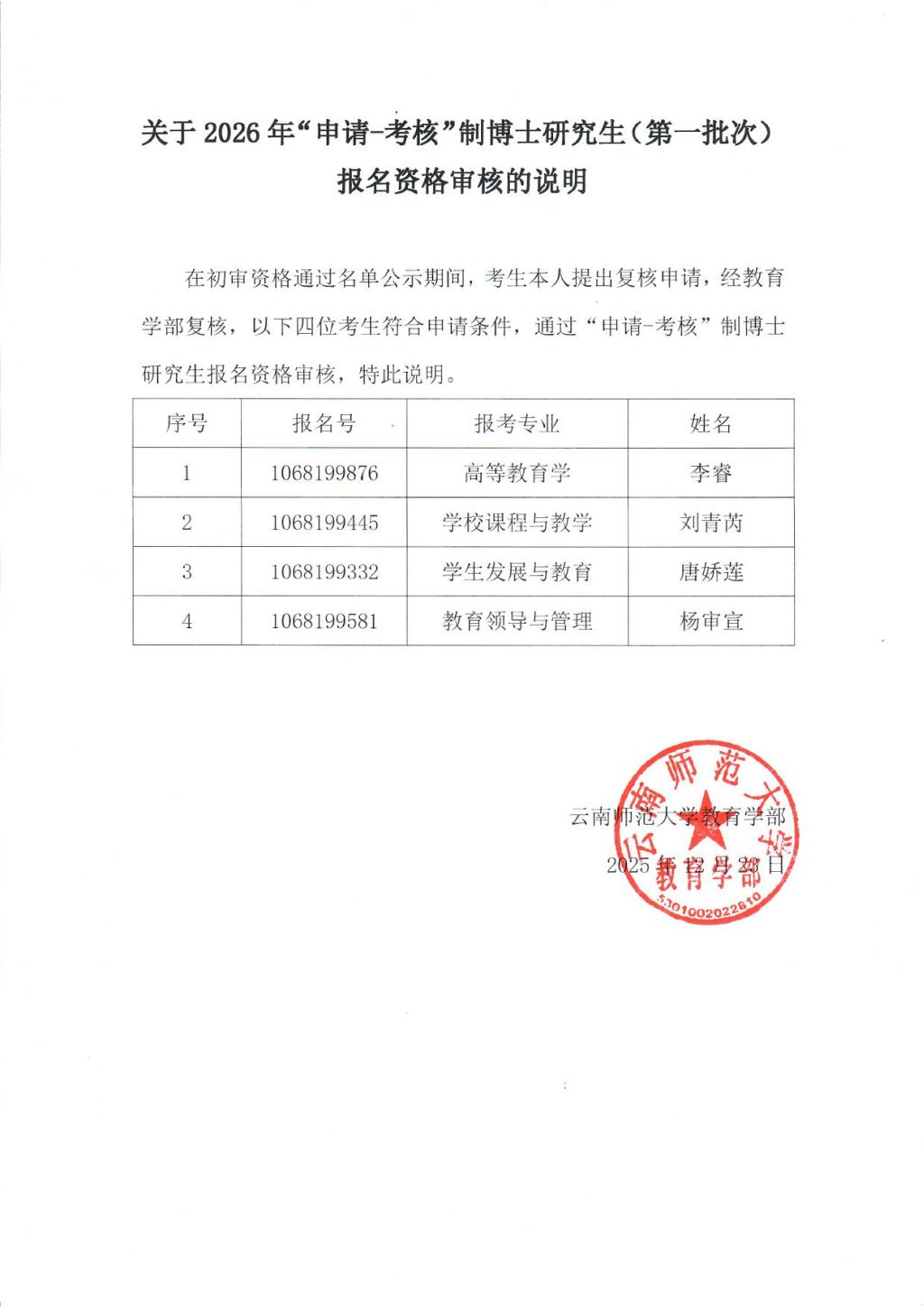 根据《云南师范大学教育学部2026年学术学位博士研究生“申请-考核”制招生选拔实施细则(第一批次)》和《云南师范大学教育学部2026年教育博士专业学位研究生“申请-考核”制招生选拔实施细则(第一批次)》的相关规定,教育学部材料审核领导小组对申请人的报名资格进行了审核,现将审核通过名单公布如下:教育学部2026年“申请-考核”制博士研究生(第一批次)报名资格审核通过名单序号报名号报考专业姓名11068199881教育学原理张力...